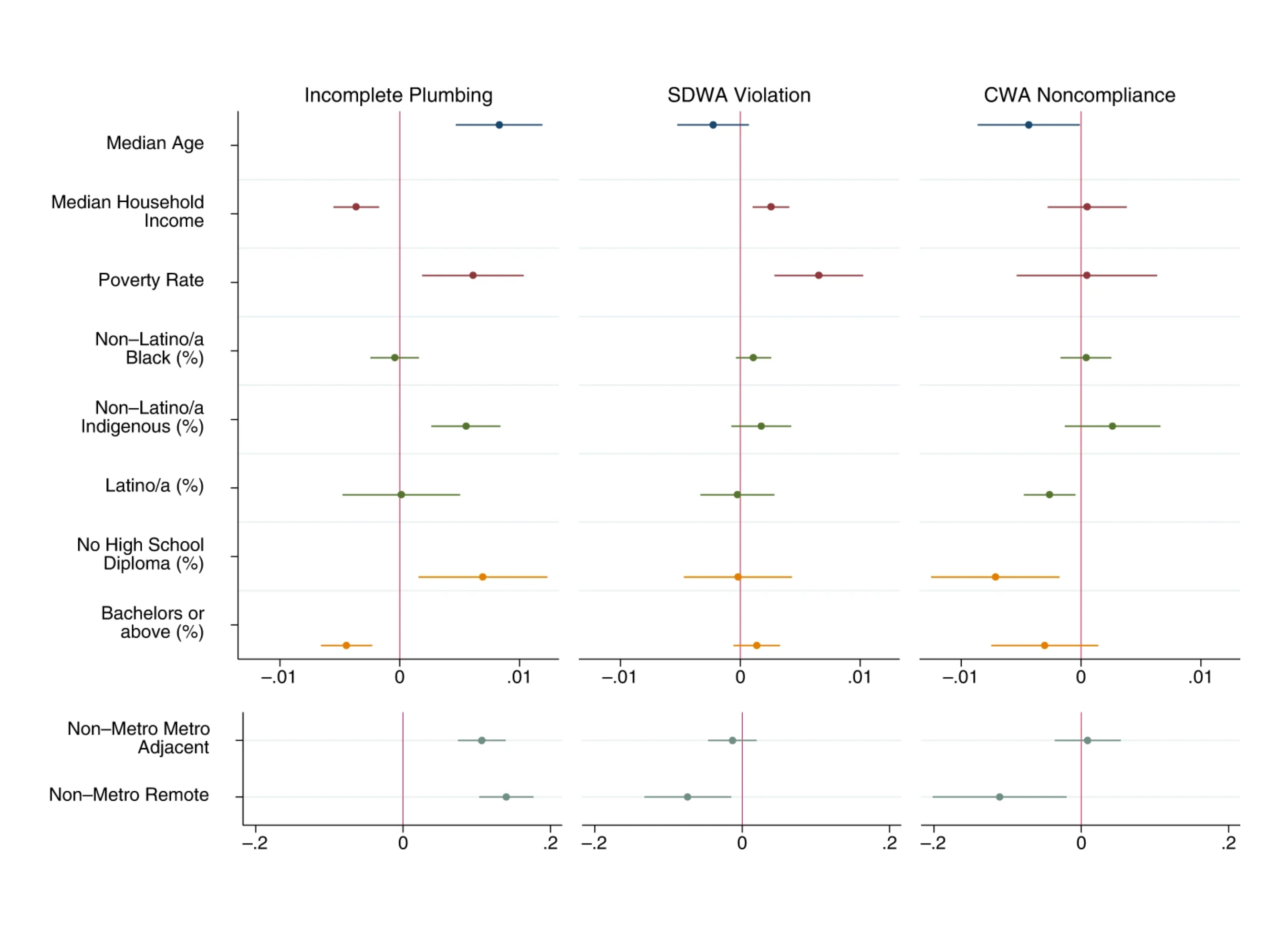 This graph plots different variables, like poverty rate or percent of indigenous people, against its corresponding p-value with incomplete plumbing, SDWA violations, and CWA noncompliance. A p-value < 0.05 is strong evidence that the relationship between variables is not a coincidence (Mueller).